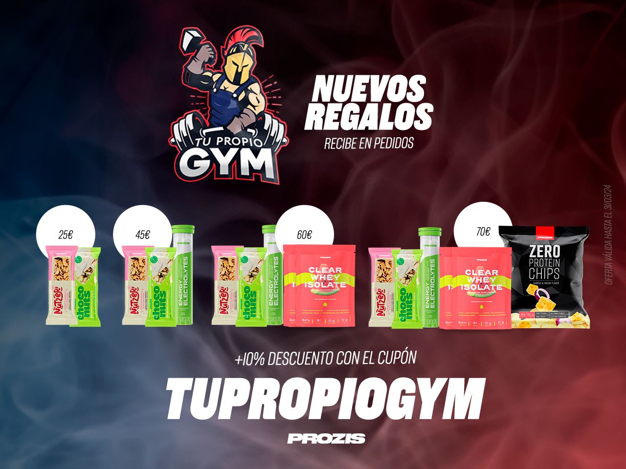 ¿Buscando ahorrar en tu compra en Prozis? Utiliza nuestro cupón de descuento "TUPROPIOGYM" para ahorrarte un 10% y llevarte algunos regalos especiales con tu compra.