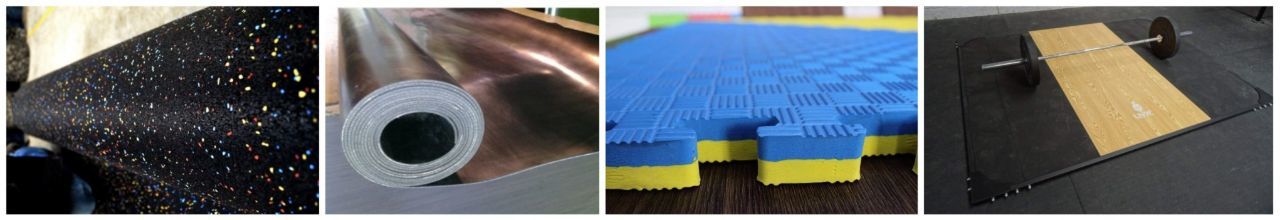 De izquierda a derecha: Suelo de caucho EPDM, caucho SBR, goma EVA y plataforma de halterofilia